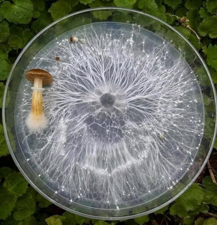 krásně tak můžeme vidět jak ve skutečnosti vypadá. Její podstatnou část totiž tvoří mycelium (podhoubí), které běžné nevidíme a je ukryté v půdě. To co jsme zvyklí označovat jako "houba", je ve skutečnosti jen její dočasná část - plodnice. Autorkou fotografie je Aimee Cornwell.
