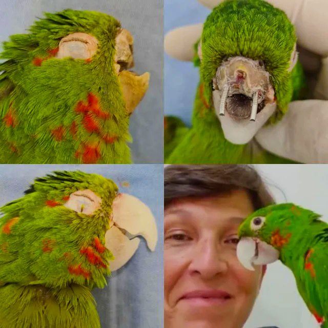 Když byl nalezen Aratinga kropenatý (Aratinga leucophthalmus) co téměř přišel o zobák, jeho šance na přežití v přírodě byly jen velice malé. Ujala se jej brazilská nevládní organizace Renascer ACN. Ve spolupráci s veterinářkou jménem Maria Ângela Panelli Marchió byla pro nebohého papouška ručně vyrobena protéza z polymethylmethakrylátu. Jde o velice odolný materiál, díky němuž bude moct žít plnohodnotný život. Kvůli obavám z prasknutí při každodenním namáhání, nemůže být vypuštěn zpět do volné přírody.