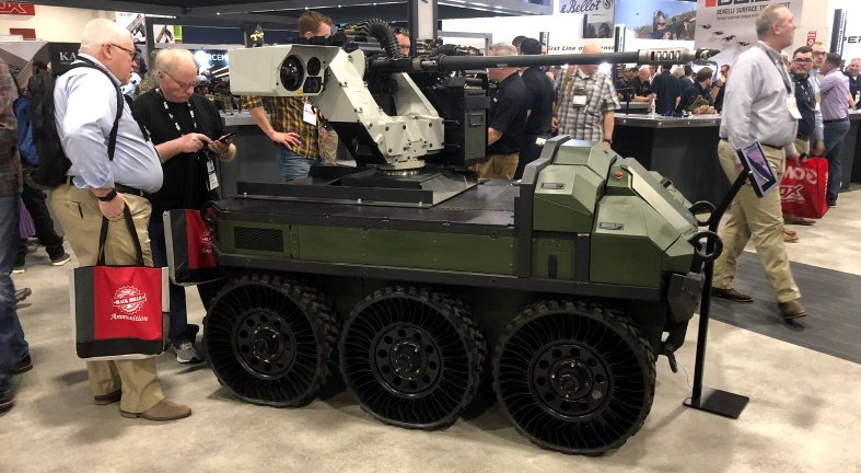 Velice zajímavé vozítko s kanónem ráže 30 mm a bezdušovými pneumatikami na ShotShow 2020.