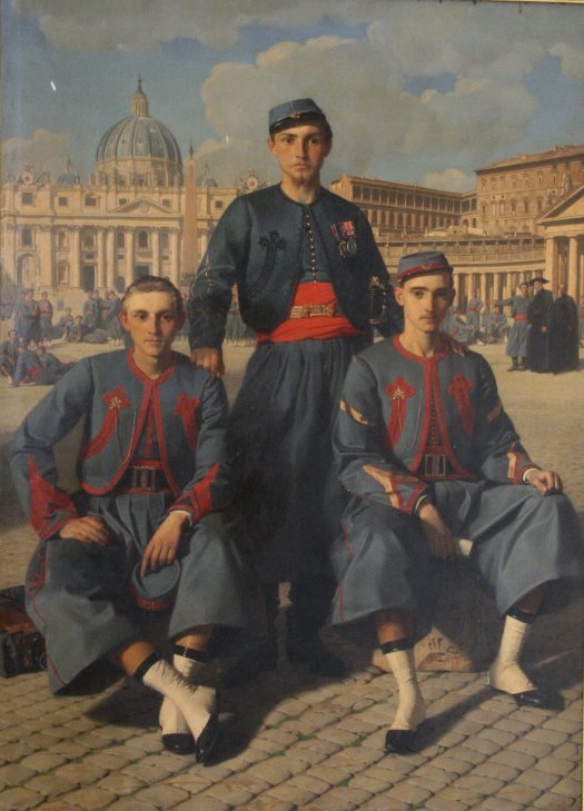 Zuávové byli původně členové speciální jednotky francouzské armády, vytvořené v roce 1830 v severní Africe z příslušníků berberského kmene Zuwawa (či Zouaoua), doplněných francouzskými, arabskými a dalšími dobrovolníky. Jednotka si brzy vysloužila velmi dobrou pověst a podobné oddíly, oblečené do uniforem podle orientální módy, pak vznikaly i v mnoha zahraničních armádách, mezi jinými též v Papežském státě. Papežští zuávové (italsky Zuavi Pontifici) byli jednotkou zahraničních dobrovolníků, založenou v Římě roku 1860 k obraně papežského státu proti italským vojskům, usilujícím o sjednocení Itálie. Šlo o mladé svobodné katolíky z nejrůznějších koutů světa. Největší podíl tvořili Holanďané a Francouzi, o poznání méně bylo Belgičanů a Italů. Další dobrovolníci přicházeli z Kanady, Irska, Pruska, ale i z Afriky či Polynésie. Rozkazy byly vydávané převážně ve francouzštině a jejich uniformy byly podobné původním francouzským - v orientálním stylu, šedomodré s červeným nebo černým zdobením. Původní fez nahradila vojenská čapka képi. Mladíci chtěli pomáhat papeži Piu IX. v boji proti vojskům sjednocující se Itálie a z vojenského hlediska patřili k elitním složkám papežské armády. Jejich množství rychle rostlo, až v květnu 1868 měli zuávové více než 4 500 mužů. Papežští zuávové se výrazně zapojili do bitvy u Mentany, kde francouzsko-papežská vojska dne 3. listopadu 1867 zvítězila nad dobrovolníky Giuseppa Garibaldiho (1807-1882). V tomto střetu se zuávové vyznamenali příkladnou odvahou, když čelili hlavnímu náporu nepřítele, což také znamenalo, že utrpěli největší ztráty. Papežští zuávové bojovali proti Garibaldimu i v září 1870, tehdy však nikdo z papežských neodolal přesile italských unionistů. Zuávové čelili přesile sedm na jednoho a byli odhodláni bojovat až do konce. Rozkaz, aby se vzdali, byl symbolickou tečkou i za jejich existencí jako papežské jednotky. Část z nich, konkrétně francouzský oddíl zuávů, však pokračovala ve vojenské službě, tentokrát však jako součást francouzské armády, která bránila zemi proti pruskému vpádu. Asi 760 zuávů francouzského původu nabídlo své služby francouzské armádě. Pod názvem Legie dobrovolníků Západu (Légion de Volontaires de l'Ouest) se zúčastnili prusko-francouzské války v letech 1870-1871. Zajímavostí je, že i nadále používali své původní uniformy i papežský žlutobílý prapor. Po dobytí Paříže pruskými vojáky v lednu roku 1871 byla jednotka definitivně zrušena. Někteří papežští zuávové španělského původu se po dobytí Říma roku 1870 vydali do Katalánska, kde se pod názvem Karlističtí Zuávové (Zuavos Carlistas) připojili k vojskům neapolsko-sicilského prince Alfonse (1841-1934) během třetí karlistické války.