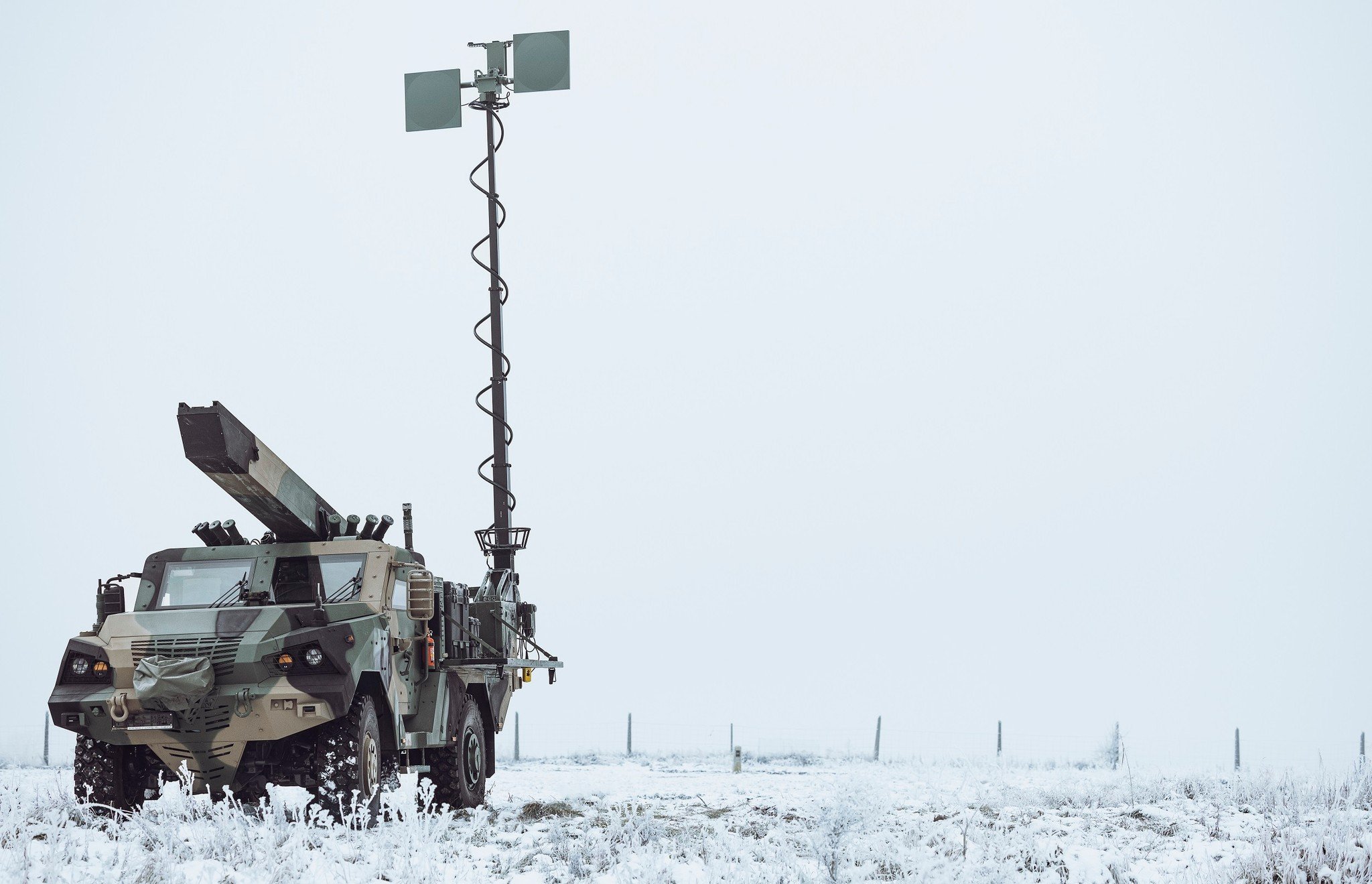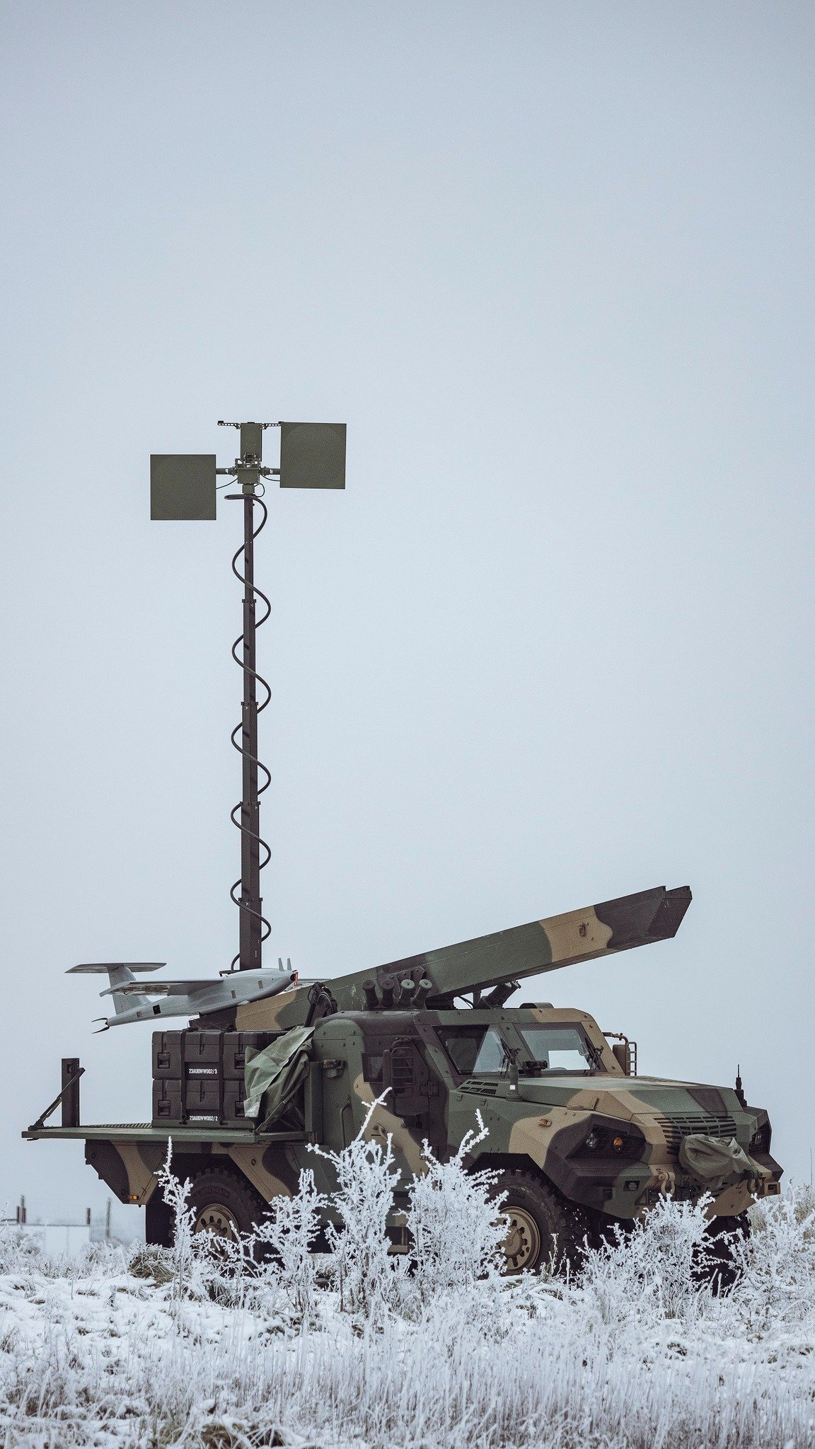 Fotky ze zkoušek polského bezpilotního systému Gladius. Vypouštěcí zařízení je na Tatra Patriot 2 alias HSW Waran 4x4