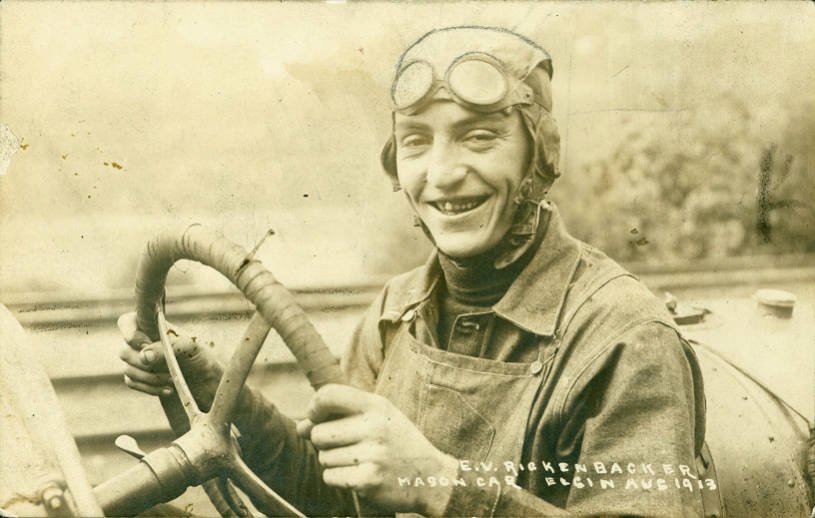 Americké letecké eso první světové války Edward Vernon Rickenbacker (1890-1973) se původně živil jako automobilový závodník. Zde na fotografii z roku 1913 ve městě Columbus v Ohiu. Svou závodní kariéru začal v roce 1910 a o rok později se účastnil prvního Indianapolis 500. Byl také automobilovým designérem, spoluzaložil firmu Rickenbacker Motor Company. Jako letec si vydobyl 26 vzdušných vítězství a stal se tak nejúspěšnějším americkým pilotem první světové války. Krom Medaile cti byl hned sedmkrát vyznamenán americkým Distinguished Service Cross, Řádem čestné legie a Croix de guerre atd. Pracoval i jako vládní poradce v oblasti vojenství. Byl průkopníkem dopravního letectví, dlouhou dobu působil jako ředitel Eastern Airlines, konkrétně v letech 1935 až 1953. Zemřel 23. července roku 1973 ve švýcarském Curychu.