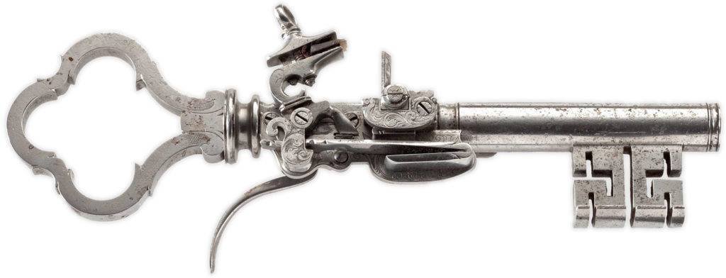 Jako malí jsme si vyráběli pistolky ze starých klíčů a naškrábaných hlaviček od sirek, ale v minulosti si vyráběli něco podobného, jen mnohem silnější a větší. Před několika stovkami let si naši předkové mnohem profesionálněji a klíče přetvořili do podoby plně funkčních pistolí. Na fotografiích tak můžete vidět krásně zdobené klíče s moderními pistolovými zámky - ať již doutnákové nebo křesadlové. Tyto pozoruhodné zbraně byly až překvapivě rozšířené. Pokud jde o historii samotných klíčů, tak jejich existenci zmiňuje již Homér ve svém díle Odyssea. Konkrétně v souvislosti s Pénelopou, která opatrovala klíč z bronzu a slonoviny. Klíče tedy znali staří Řekové od 8. století př.n.l., archeologické vykopávky v Thébách svědčí o existenci zámků s klíči od 3. století př.n.l. Klíče se lišily svým provedením již v dávné minulosti. Byly zdobené zejména na očku (část určená k držení rukou), různě tvarované, a lišily se vahou, délkou i použitím materiálů. Tyto zdobné úpravy se používaly až do sklonku 19. století, kdy technický vývoj znamenal složitější zámek oproti zjednodušeným klíčům. Protože vlastnictví některých důležitých klíčů bylo odznakem důstojnosti, nosívaly se zavěšené na krku na zlatém řetězu. Mnohé klíče u královských dvorů měly svá pojmenování, např. Komorní klíč na dvoře Marie Terezie atd.