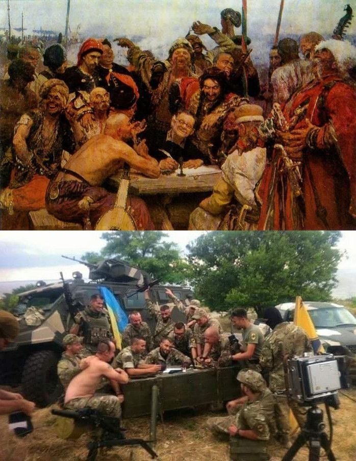 Obraz Ilji Repina (1844-1930) Záporožští kozáci píší dopis tureckému sultánovi si našel na Ukrajině množství parafrází již od počátku ruské invaze.