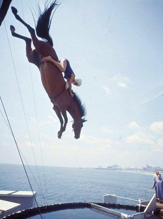 S tímto netradičním nápadem přišel americký ostrostřelec William Frank "Doc" Carver (1851-1927). Roku 1881 se pod ním a jeho koněm zhroutil most přes řeku Platte v Nebrasce. Obratem si uvědomil, že by se mohlo jednat o zajímavou podívanou pro obecenstvo a začal cvičit potřebná zvířata. Kůň mohl skočit, až byl sám připraven. Musel být v klidu, nebylo dobré ho k čemukoliv nutit. Na slavném molu Steel Pier v Atlantic City koně skákali z výšky 18 m do bazénu hlubokého pouhé 3 m. Skákalo se rovněž v zábavním parku White City v Massachuetts nebo newyorském Hipodromu. V době soutěží skákali koně do vody čtyřikrát denně po sedm dní v týdnu a zdá se, že je to bavilo. Skoky probíhaly rovněž s jezdci na hřbetě, ale tato disciplína byla překvapivě nebezpečnou. Carverova snacha Snora, přišla při jednom ze skoků o zrak (poškozená sítnice), pokud jde o koně tak ti vždy vyvázli bez zranění. Skoky se konaly až do 30. let 20. století, s menší četností až do 70. let, kdy je zakázali ochránci zvířat. Sport tak zanikl, výjimkou jsou občasné show v Lake George v New Yorku, v tamním zábavním parku Magic Forest. Původně zde skákal kůň jménem Rex a později jej nahradil valach jménem Lightning. Dle manažerových slov skáče kůň zcela sám: žádný jezdec, žádné výstřely, žádné elektrické šoky a podobné triky. Kůň skáče dvakrát denně během dvouměsíční sezóny a zbytek roku má volno.