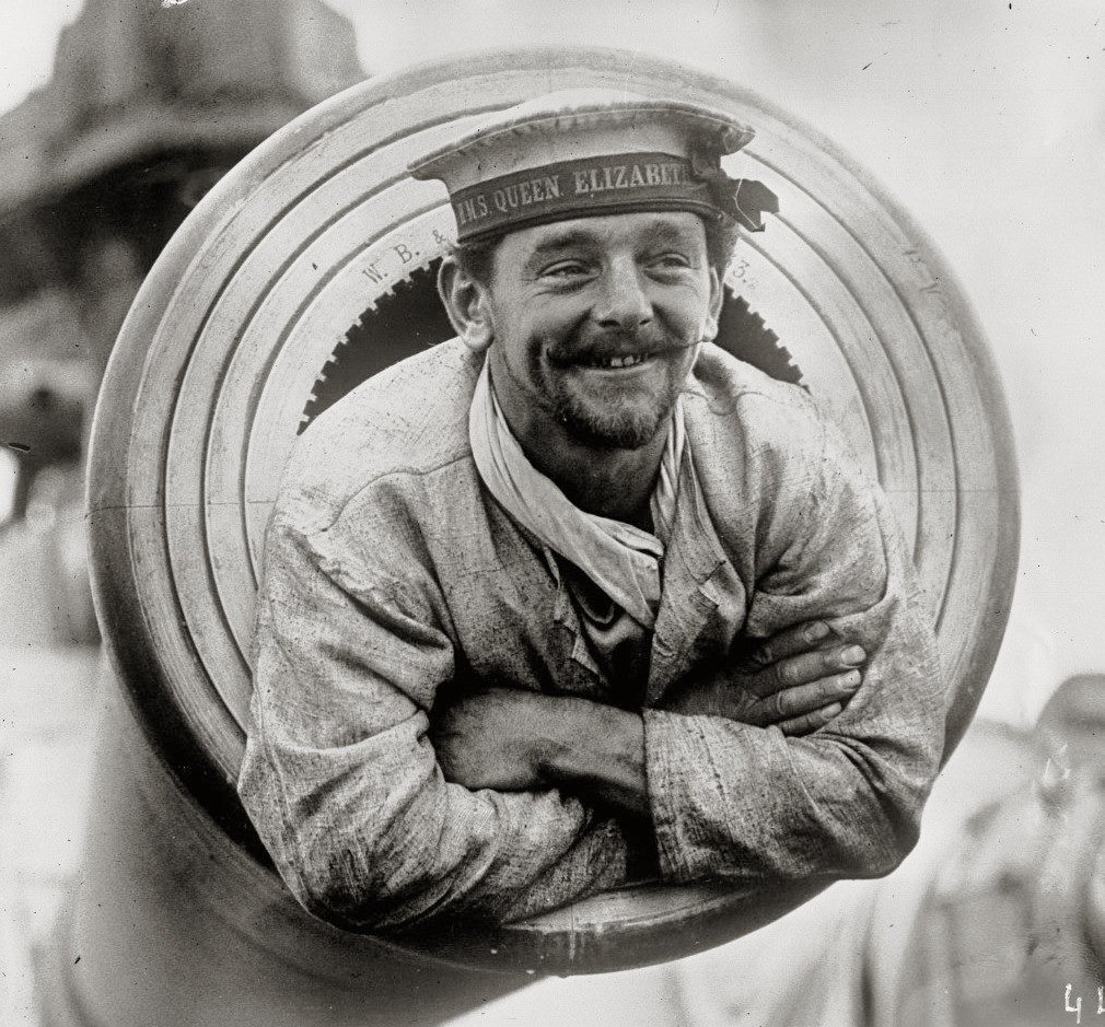 Britský námořník z bitevní lodi HMS Queen Elizabeth, se nasoukal do jedné z hlavní ráže 381 mm, kanónu BL Mk I. Jednalo se o první britský kanón této ráže, zároveň nejdéle a nejvíce používaný těžký kanón vyvinutý britským námořnictvem - od roku 1915 až 1959. Své jméno loď dostala na počest královny Alžběty I. V roce 1915 se jako jediná moderní bitevní loď zúčastnila bitvy o Gallipoli. Později se stala součástí britské 5. eskadry bitevních lodí, ale během bitvy u Jutska v roce 1916 se nacházela v doku. Od roku 1937 byla rozsáhle modernizována a v pořádku se dočkala i konce druhé války. V roce 1945 byla vyřazena a v roce 1948 byla prodána do šrotu