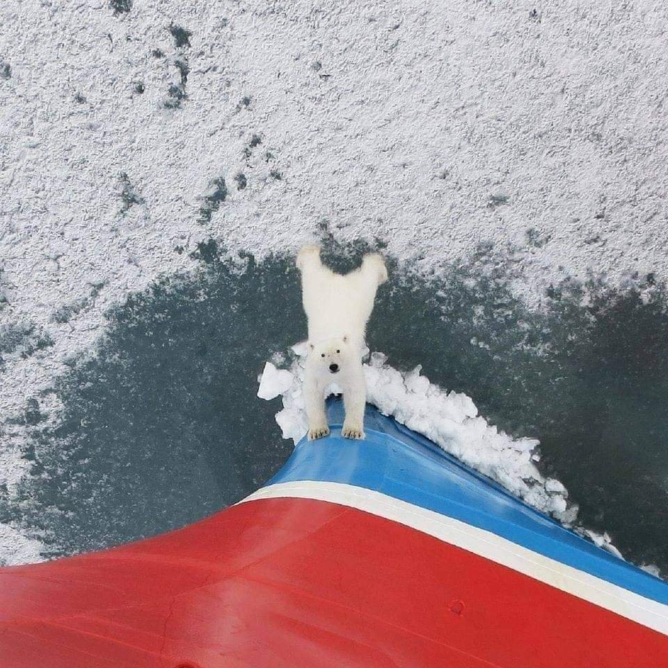 Pan lední medvěd se snaží roztlačit loď uvízlou v ledu