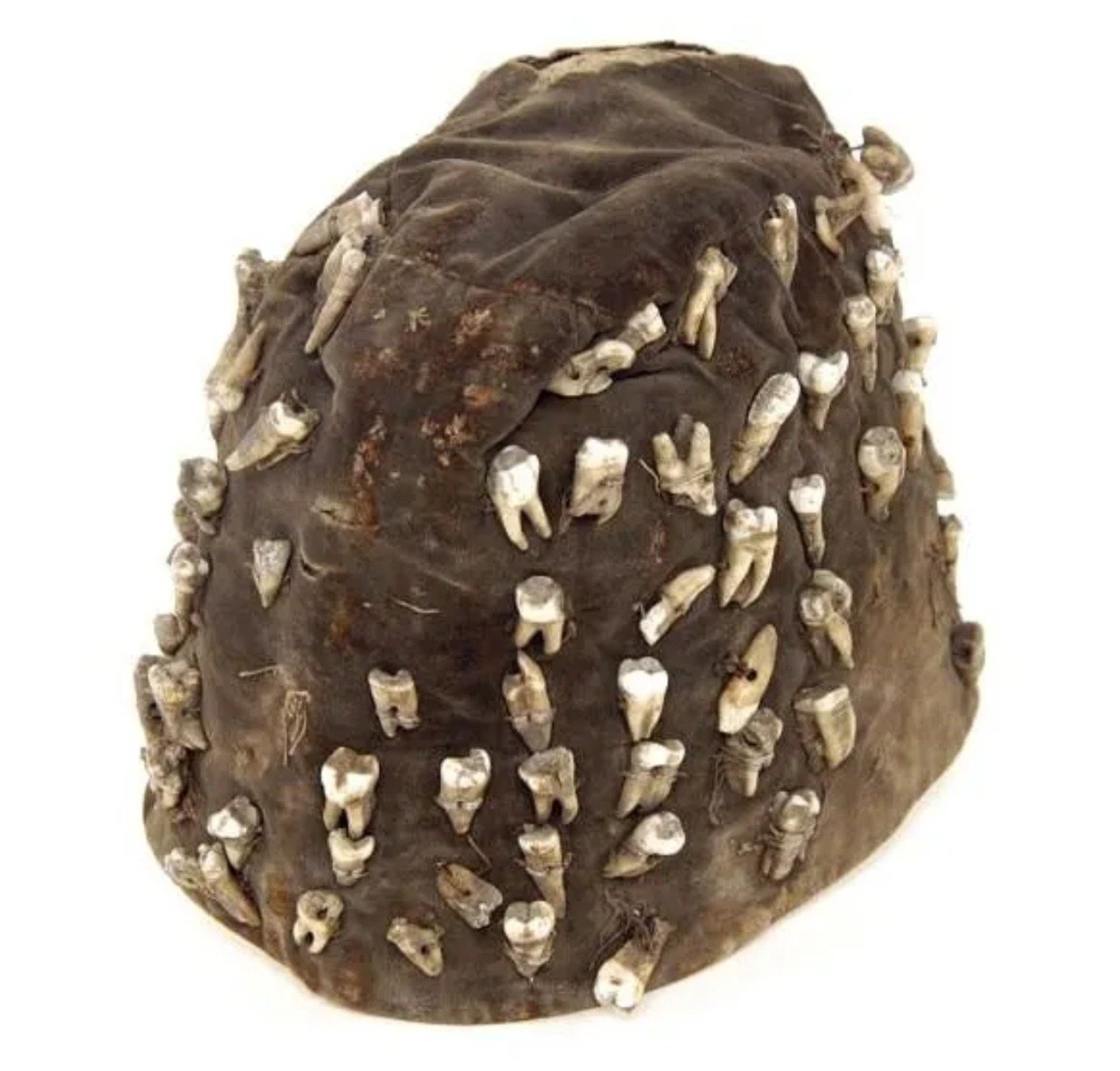 Klobouk s našitými zuby, který nosil potulný zubař v 19. století