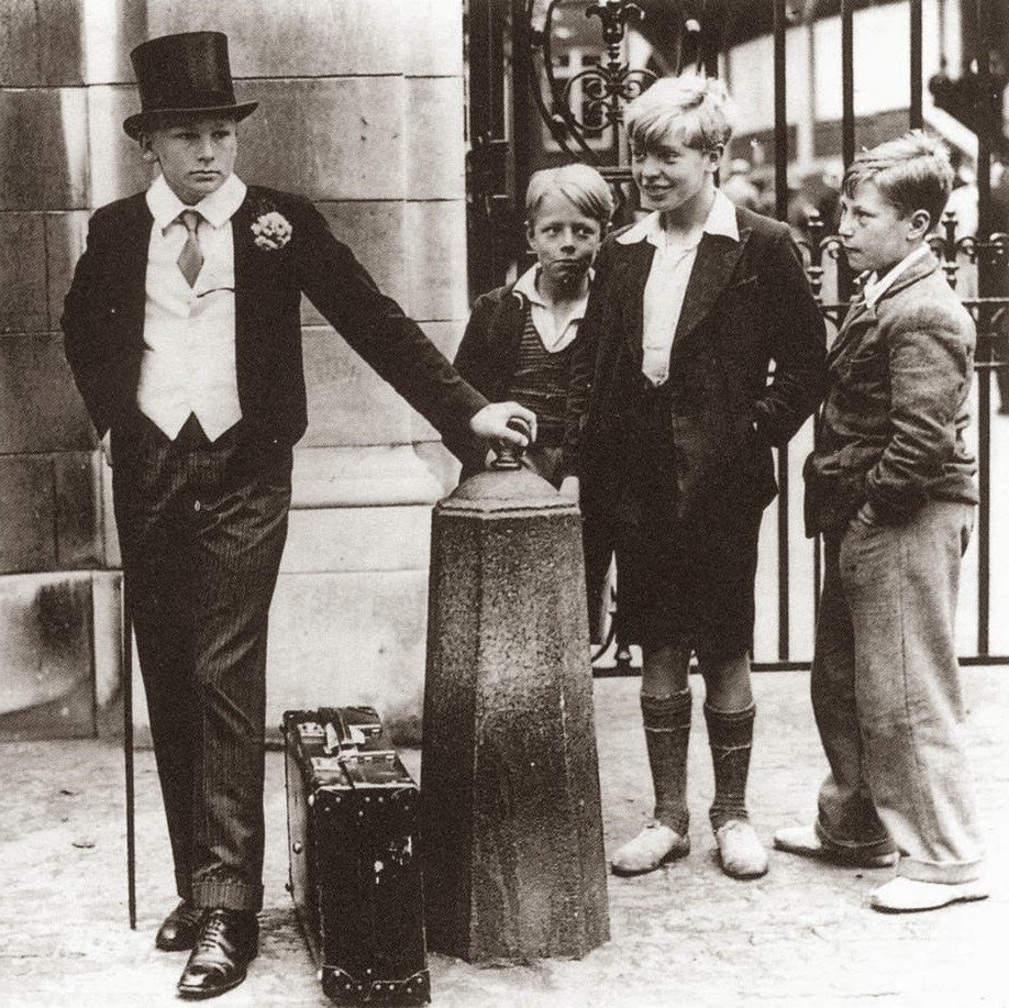 jedná se o fotografii pěti chlapců, která ilustruje rozdíly v britském třídním systému. Dva jsou oblečeni uniformě školy v Harrow a tři mají civilní oblečení dělnické mládeže. Studenti Harrow byli (zleva) Peter Wagner a Thomas "Tim" Dyson. Dělničtí kluci jsou George Salmon, Jack Catlin a George Young. Zajímavé jsou jejich pozdější osudy. Peter Wagner vstoupil do rodinné makléřské firmy, oženil se a měl tři dcery; v roce 1970 se zbláznil a zemřel v nemocnici v roce 1984, ve věku 60. Tim Dyson měl nejsmutnější osud. Už za rok mu bude diagnostikován záškrt a Tim zemře 26. srpna 1938 ve věku šestnácti let. Jeho otec Lt.-Col. George St John Armitage Dyson byl zajat Japonci v Singapuru a zemřel v zajateckém táboře v Koreji 22. listopadu 1942. George Young a George Salmon se oba oženili, Young začal podnikat v čištění oken a zaměstnal zde i své čtyři syny. Salmon za války sloužil na lodi HMS Duckworth. Později pracoval pro Rightons Limited, zemřel po prožití šťastného života, roku 2000 v Marylebone. Rodina Jacka Catlina se přestěhovala do Rickmansworthu. později se dvakrát oženil a žije v Weymouthu.