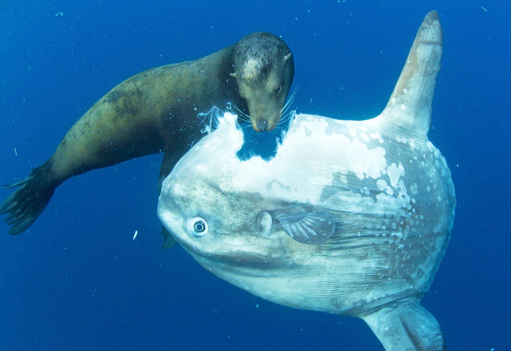 Sérii pozoruhodných fotografií zachytil fotograf Ralph Pace u pobřeží San Diega. Obvykle tyto obrovské ryby napadají jen velcí predátoři jako žraloci a kosatky, ale lachtani se o to pokoušejí jen zřídka – a rozhodně ne u takto velkých exemplářů. Lachtani obvykle jen trhají ploutve měsičníků ale nekonzumují je. Tento jej však napadal a požíral jeho vnitřnosti více než hodinu. Měsíčník svítivý (Mola mola) žije na volném moři mírného a tropického Atlantského, Tichého a Indického oceánu. Tito pomalí, rozvážní plavci se živí hlavně živočišným planktonem, medúzami i menšími druhy korýšů a ryb. Navzdory svému vzhledu jsou tato zvířata extrémně atletická a je známo, že se potápějí za potravou až do hloubky 792 metrů. Každý den se vracejí na povrch, aby se zahřáli, což jim umožňuje zůstat v hloubce delší dobu. Často tedy plavou těsně u hladiny s hřbetní ploutví vystrčenou ven nebo leží na boku. Podle některých odborníků se ale takto nezahřívají, ale jde o poraněné nebo nemocné jedince. Měsíčník svítivý je schopen se naučit krmení z lidských rukou. Je ale lepší se s nimi moc nekamarádit. Je o nich totiž známo, že hostí více než 40 různých parazitů - ve skutečnosti mají někteří jejich parazité dokonce své vlastní parazity. Měsíčník má pro svou ochranu pevnou kůži zpevněnou kostmi, ale tato ochrana je nejtenčí právě těsně pod ústy. Hladový lachtan se tam mohl poměrně snadno dostat do jeho tělesné dutiny.