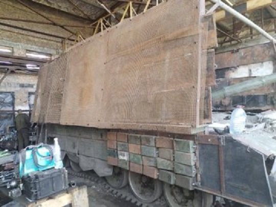 Ruský tank v plechové "krabici", který dnes útočil na ukrajinské pozice ve směru na Krasnohorivku v Doněcké oblasti.