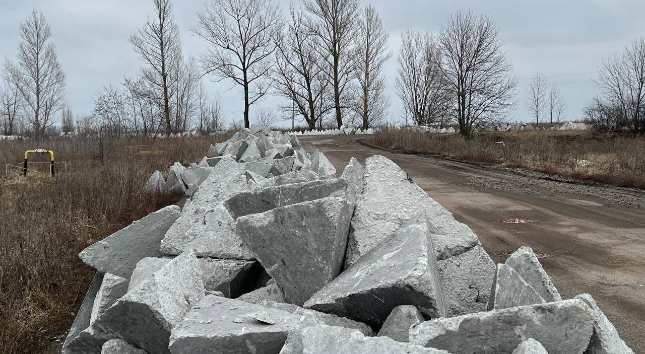 Ukrajinská obranná linie. Nebo tedy která měla být a jak to dopadlo. Ruská armáda objevila skládku dračích zubů určených na zastavení či zpomalení techniky.