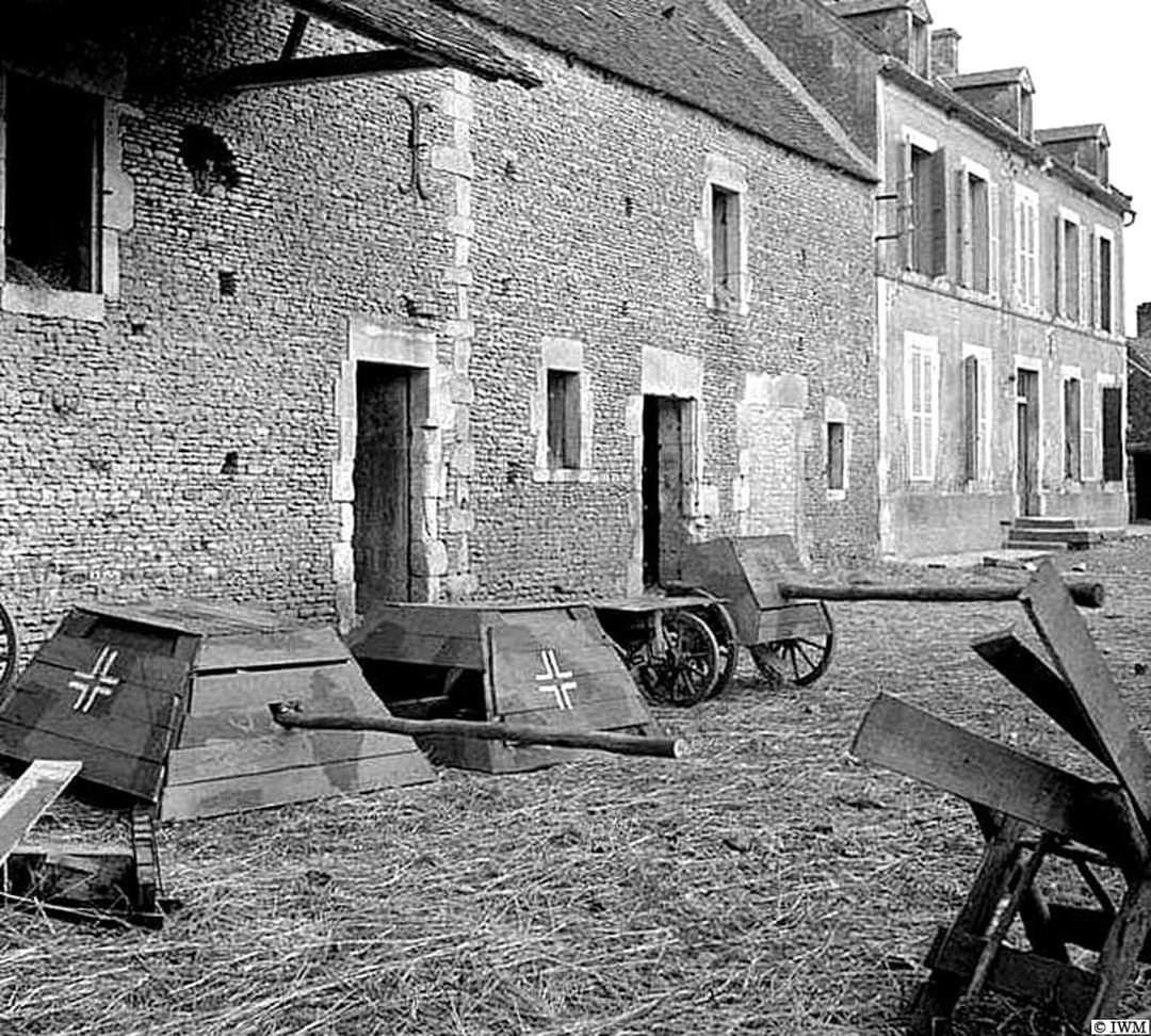 Německé atrapy tankových věží a protitankových děl nalezených na hospodářském dvoře na silnici do Livarot. 21. srpna 1944, Normandie.