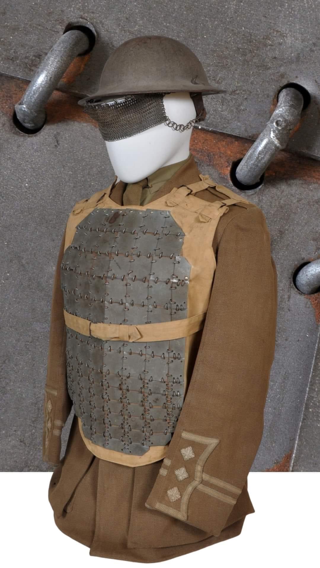 Tak jsem zjistil, že se opravdu jedná o dobovou "neprůstřelnou vestu", někdy označovanou jako "Intermediate body armour" nebo "Franco-British Cuirass". Výroba probíhala ve Francii, ale prodávaly se britským vojákům. Jednalo se o takové ocelové pončo, přičemž přední i zadní část byly pokryty malými ocelovými destičkami čtvercového, nebo obdélníkového tvaru. Tyto destičky měly zaoblené hrany a byly vzájemně spojeny železnými kroužky. Následně byly připevněny k plátěnému základu. Ten byl tvořen dvěma díly, které byly spojeny v oblasti ramen. Pro lepší pohyb byla vesta stahována v bocích pomocí opasku, provázku nebo kusu látky.