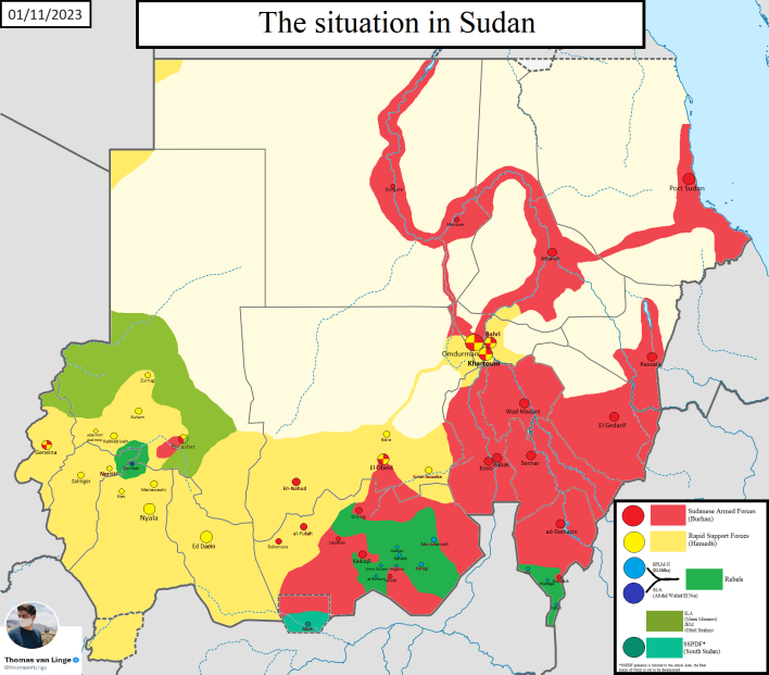V Súdánu v současné době probíhá již sedmý měsíc nová rozsáhlá válka mezi Súdánskými ozbrojenými silami (SAF) a Silami rychlé podpory (RSF) - oběma složkami bývalého vojenského režimu, který v roce 2021 svrhl civilní vládu a poté zemi přivedl do občanské války. SAF (červené) kontrolují většinu údolí Nilu a východní provincie a přístavy země. RSF (žlutá) kontrolují většinu západního Dárfúru, většinu regionu hlavního města a části Severního a Západního Kordofánu. Bývalí povstalci, kteří v Dárfúru bojovali proti RSF i SAF, zůstali dosud neutrální, včetně dvou největších frakcí Súdánské osvobozenecké armády (SLA). Jednu z nich vede Minni Minawi, který v roce 2020 podepsal mírovou dohodu se súdánskou vládou a stal se guvernérem Velkého Dárfúru. Jeho síly jsou soustředěny převážně v Severním Dárfúru (světle zelená barva). Druhou frakci SLA vede Abdelwahid al-Nur, jehož jednotky kontrolují centrální hornatou oblast Dárfúru, Džebel Marru (tmavě zelená). Další významnou ozbrojenou skupinou je SPLM-Sever, dlouholetá povstalecká skupina, která kontroluje velké části pohoří Nuba a část státu Modrý Nil (tmavě zelená) podél jižní hranice země s Jižním Súdánem. V posledních třech měsících od poslední aktualizace mapy získaly RSF převahu ve velkých částech západního Súdánu. Významné územní změny od té doby zahrnují upevnění kontroly RSF nad velkou částí Chartúmského státu, získání dalších území v Severním Kordofánu, včetně Umm Ruwaby, a také posádek v Zalingei a Nyale. Mapa je přibližná a nemusí nutně zachycovat všechny složitosti situace. Například síly RSF operují v celém Severním Dárfúru, včetně oblastí označených jako kontrolované SLA-Minawi. Stejně tak se tyto jednotky mohou volně pohybovat po částech Dárfúru a Kordofánu kontrolovaných RSF, a to za účelem doprovodu humanitárních a obchodních konvojů z Kosti do El Fasheru.