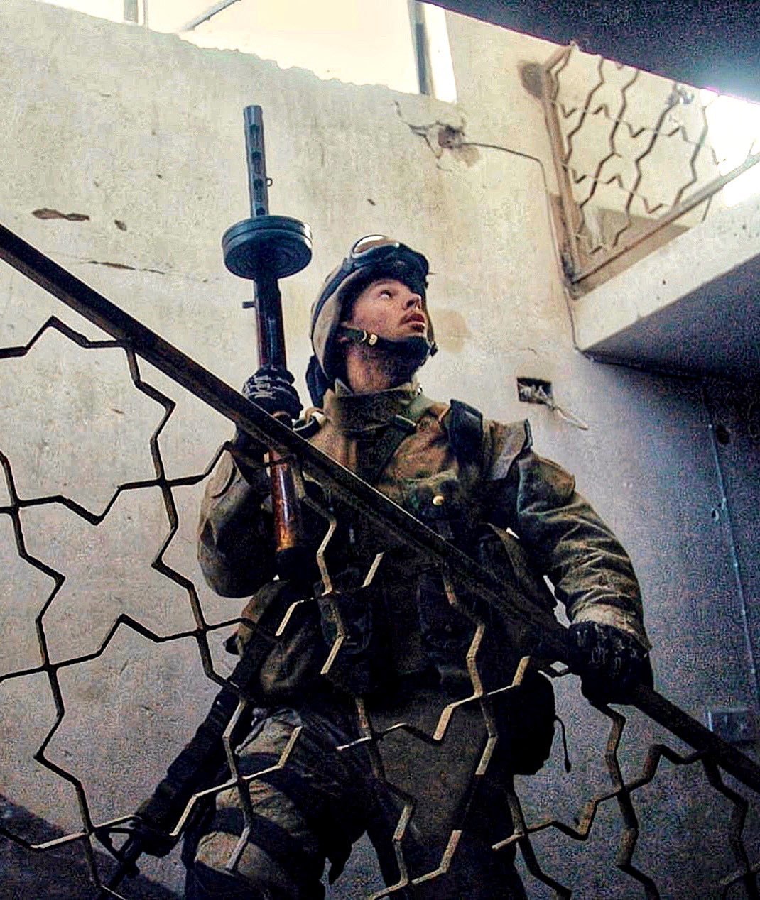 Příslušník americké námořní pěchoty s ukořistěným Špaginem při prohledávání budov během operace "Phantom Fury" v Fallúdži listopadu 2004.