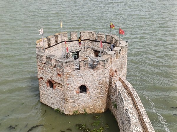 Třípodlažní 14 metrů široká stavba byla lehce kónická. V přízemí byly dělostřelecké střílny a výpadní branka. Uprostřed vedlo točité schodiště do druhého podlaží. I zde byly uprostřed stran dělostřelecké střílny. Hradební ochoz pak sloužil pro umístění lehkých zbraní. Tato stavba byla spojená hradbou s věží u brány (8). Vše bylo vybudováno na nasypaném a zpevněném valu. Celek tvořil chráněný přístav, kde mohly přistávat lodě přímo u hradu. Před hradem bylo hospodářské předhradí. Z jeho zástavby se zachovaly některé základy staveb včetně tureckého hammámu. Chybí ale známky nějakého masivnější opevnění. To bych třeba nejméně po opanování hradu Turky očekával. Zřejmě stačil jen hrad.