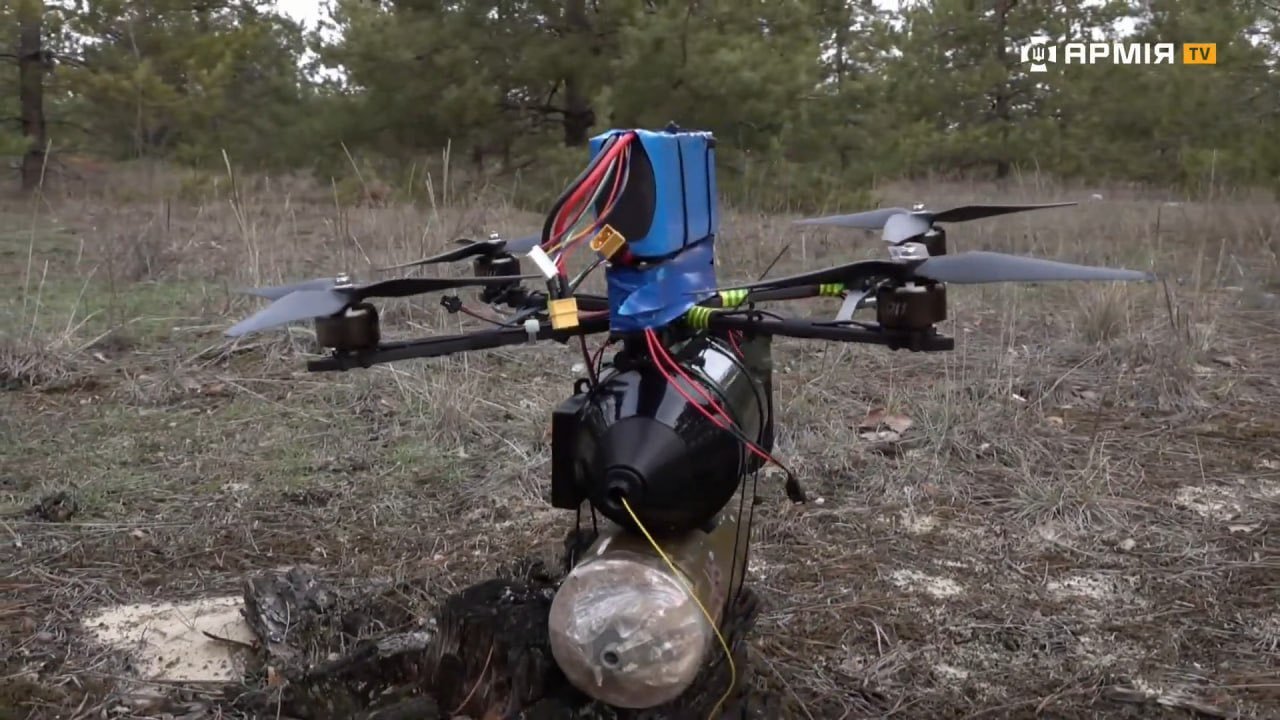 Ukrajinský optický FPV dron s podvěšeným hlavním nábojem z tandemového kumulativního granátu PG-7VR z RPG-7.