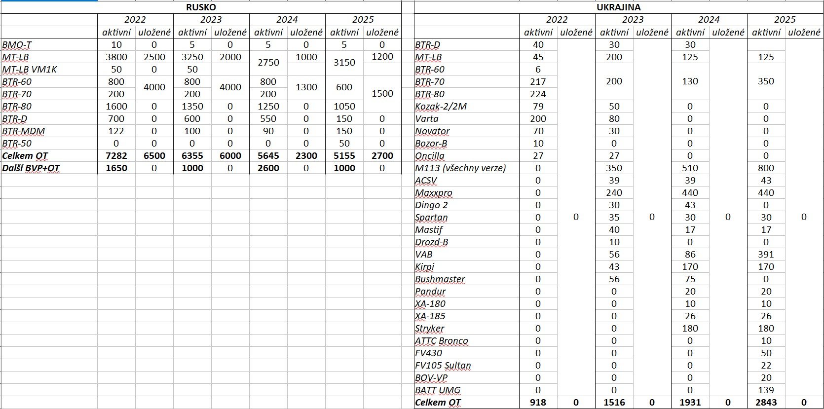 Na základě ročenky The Military Balance (č. 2022-2025) jsem sestavil tabulku vývoje hlavních druhů pozemní bojové techniky a zbraní. Uvádím počty zbraní těch, které uvádějí i v ročence. Kromě nich zařazují do výzbroje i další techniku, ale tam kde neuvedou alespoň přibližné počty tak tuto techniku neuvádím. U některé techniky uvádějí počty minimální (např. 30+), tam vynechávám + a u pár uvádějí "jednotky kusů" (some) a tam jsem zvolil počet "5". Výjimka je BM Oplot, kde uvádějí přímo 5 kusů. V řádku "Další BVP+OT" u Rusů jsou uvedena BVP a OT ve výzbroji ruské národní gardy, u kterých je uveden jenom celkový počet a že se jedná o vozidla typu BMP a BTR.