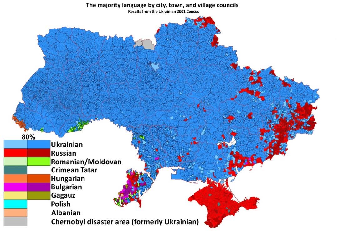 Foto: Charkov. | Zasažený vůz s chleby. | Sebeidentifikace populace podle mateřského jazyka v roce 2001.
