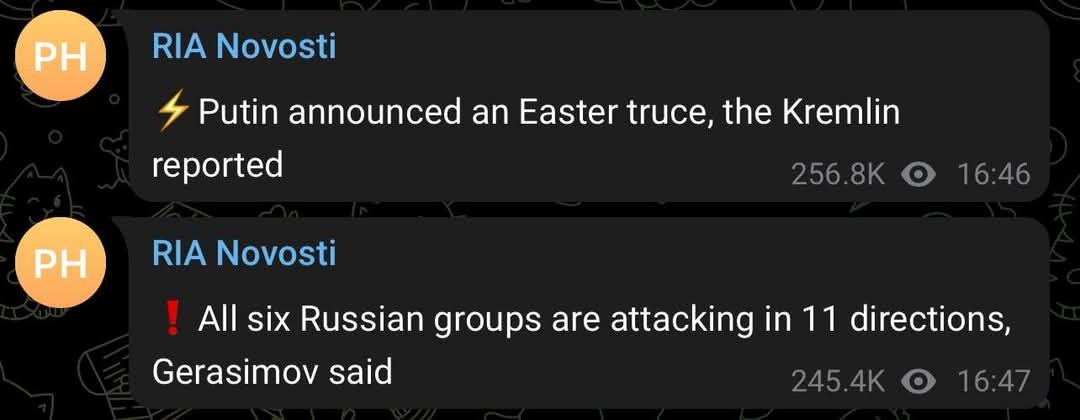 Neděle. Snad jste si nemysleli, že by Rusové dodrželi své slovo a skutečně nastalo ohlášené „Velikonoční příměří“? Ruská armáda ani na vteřinu nepřestala podnikat ofenzivní akce, aktivní bylo i ruské dělostřelectvo, a to jak to hlavňové, tak raketové. Některé obce byly dokonce pod mnohem intenzivnější palbou než obvykle. Úsek fronty Pokrovsk-Siversk hlásí od rána nejméně 26 ruských útoků. Na zlomku úseků pak Rusové zneužili příměří, aby pod záminkou, že jdou sbírat z bojiště své padlé, vyslali ženisty, kteří se pokoušeli odhalit a odstranit protipěchotní a protitankové zábrany a miny. Celé to zkrátka byla naprostá fraška, která měla jediný účel: propagandistický. Šlo o to, nasytit informační prostor zprávami o Putinově dobrosrdečném gestu a vzápětí o nevděčných Ukrajincích, co příměří nectí. Zelenskyj přitom oznámil, že pokud skutečně dojde ke klidu zbraní, Ukrajina je připravena ho prodloužit ne na 30 hodin, ale 30 dní. Každopádně českým příznivcům MAGA hnutí nic z toho nebránilo, aby vychválili do nebe Donalda Trumpa za to, že Velikonoční příměří je jistě výsledek jeho skvělé diplomatické práce. Konzumenti dezinformací zkrátka žijí v úplné paralelní realitě, která má s tou skutečnou realitou jen pramálo společného. A ještě se stalo tohle: