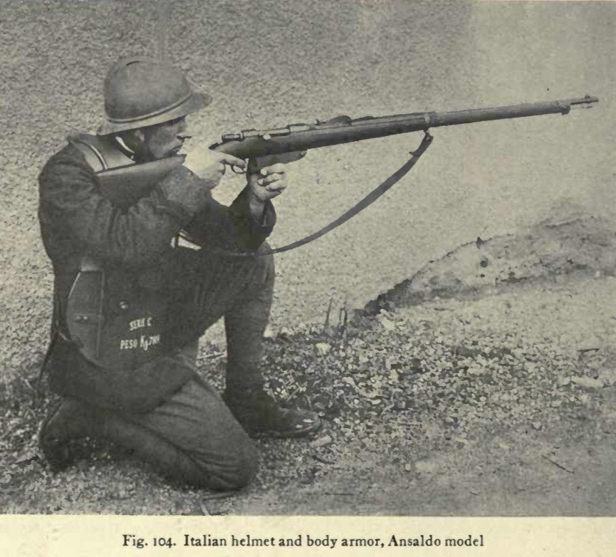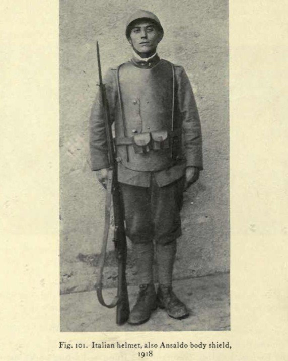 Koncem války vyráběla dílna Cocietà Anonima Italiana z Janova, zvláštní hrudní pancíř – typ Ansaldo. Materiálem byla ocel obohacená o chrom, nikl a vanad. Tato ocel dokázala odolat projektilům o rychlosti 760 metrů za sekundu, na vzdálenost 90 metrů. Tloušťka použité ocele byla 6 mm a celý kyrys vážil 21 liber (9,5 kg). Vyráběly se ale i lehčí varianty o váze 19, 17 a i 16 liber. Pancéř bylo možno nosit i jako štít, který vojáci mohli nosit před sebou, nebo si za něj lehnout, jako za zákopový štít. K tomuto účelu byl pancéř vybaven otvorem, kterým bylo možno prostrčit hlaveň pušky. Díky tomuto okénku bylo možno vést palbu v leže. Pokud byl pancíř nošen na hrudi, otvor byl jednoduše zaklopen plátem kovu na pantu. Bohužel se neví, kolik pancéřů bylo během války vyrobeno.