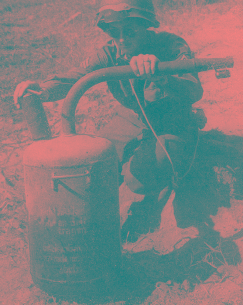 Americký voják s německým statickým plamenometem Abwehrflammenwerfer 42.