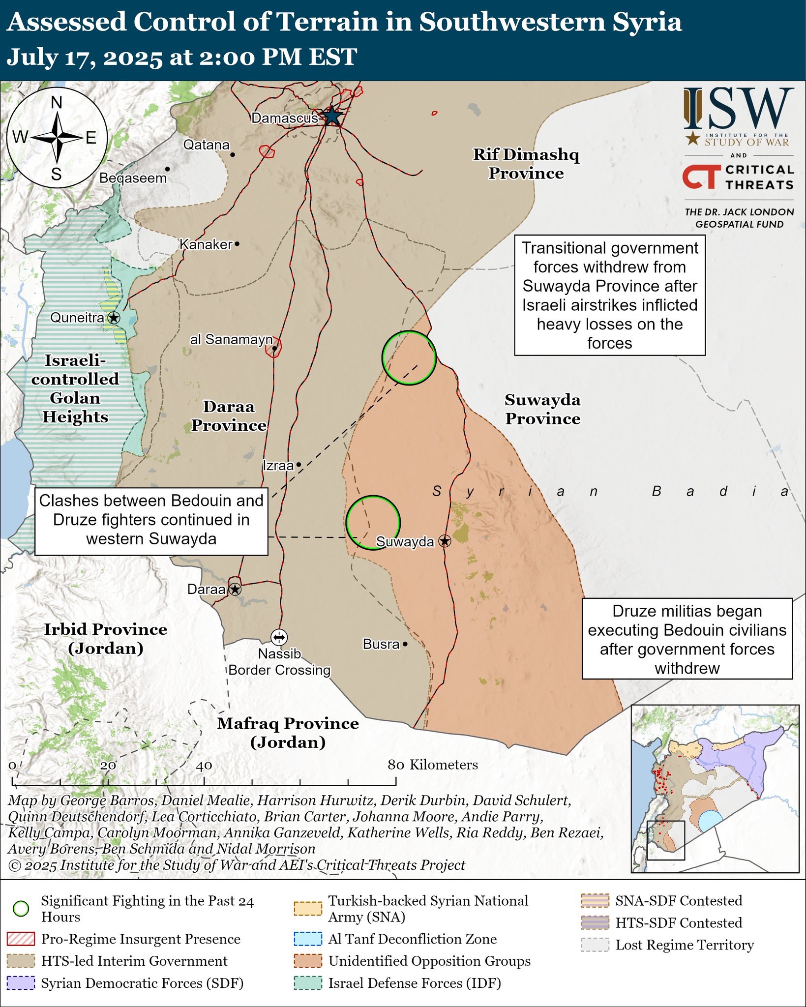 Syrské přechodné vládní síly se 16. července stáhly z provincie Suvajda poté, co izraelské nálety provedené na podporu drúzských frakcí způsobily přechodným vládním silám těžké ztráty. Stažení vládních sil nepřineslo do provincie Suvajda mír a přispělo k bezpečnostnímu vakuu, které hrozí dalším násilím. Drúzské milice měly obratem začít popravovat beduínské civilisty.