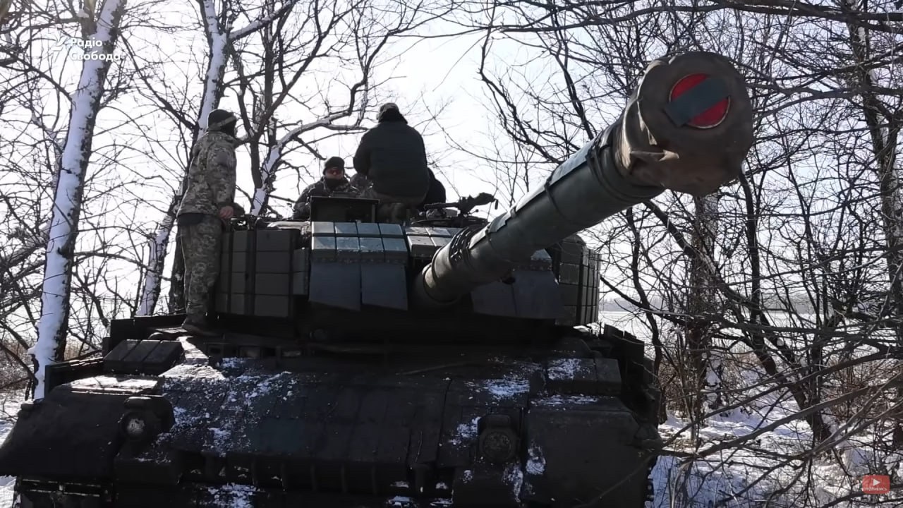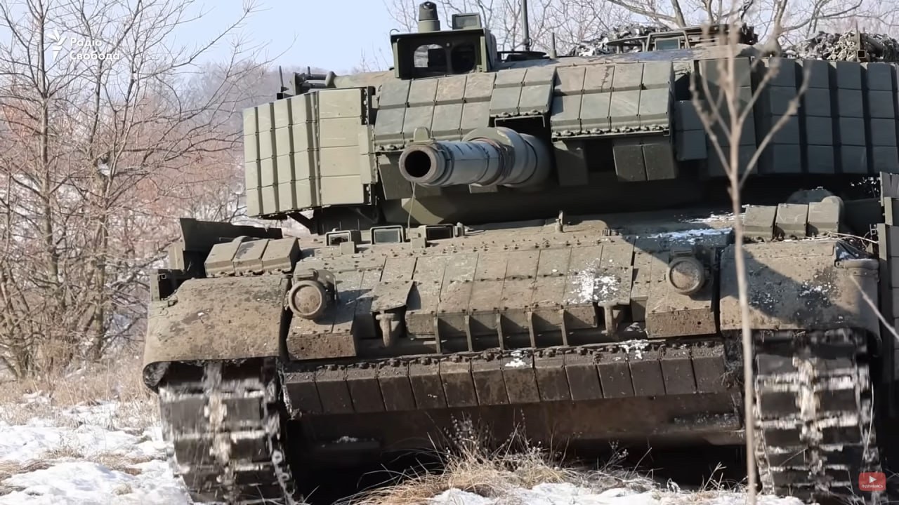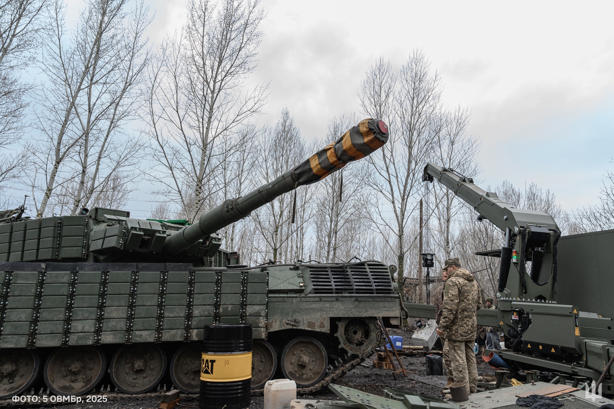 Ukrajinský Leopard 1A5DK ze 44. samostatné mechanizované brigády během cvičení, únor 2025. Tank je osazen bloky Kontakt-1, Nož a ochranou proti kamikadze dronům.