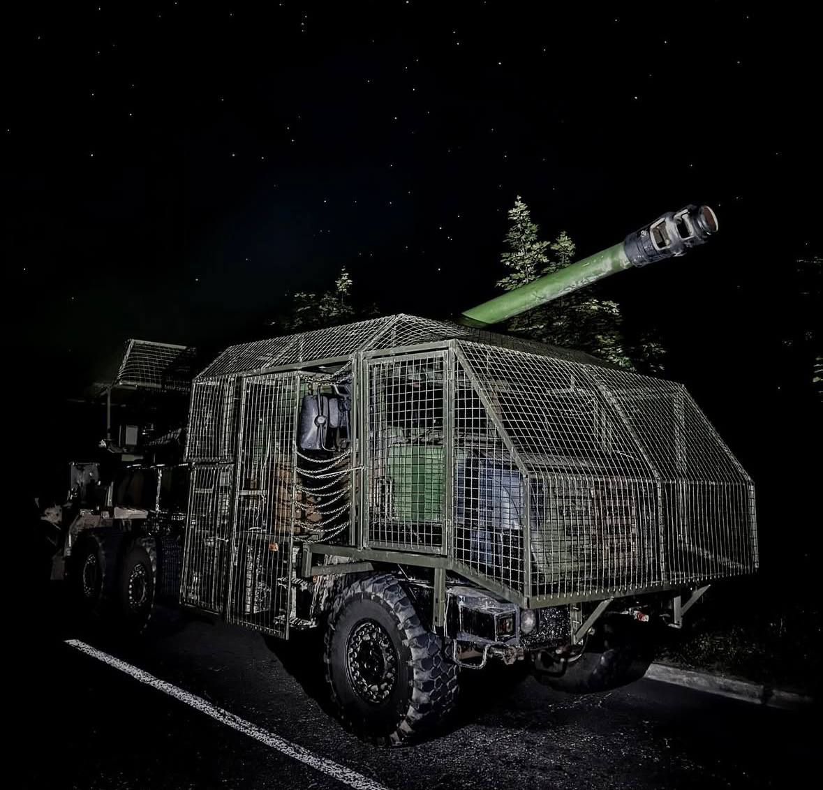 Další samohybná houfnice CAESAR ukrajinských ozbrojených sil vybavená dodatečným ochranným pancéřováním z mříží proti dronům.