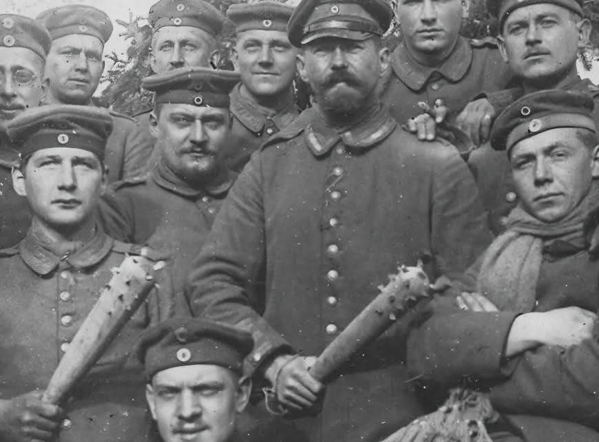 Němečtí vojáci z první světové války s palicemi, Francie, 1915. Palice s ostny se používaly během nočních výpadů do zákopů jako tichá a účinná zbraň k likvidaci nepřátelských vojáků.