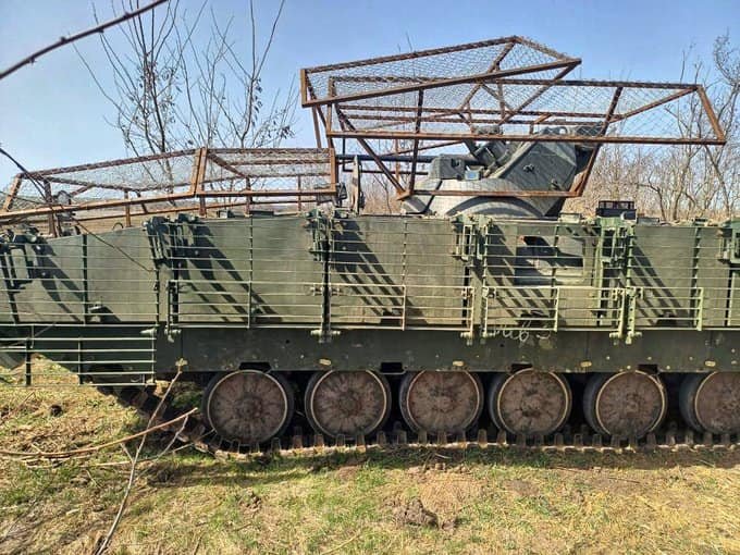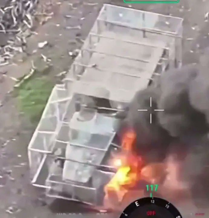 Střecha je grunt. Další ruské bojové vozidlo s podobným improvizovaným pancéřováním dnes zaútočilo na ukrajinské pozice ve směru na Krasnohorivku. Jak již bylo zmíněno, na vozidle je také nainstalováno velké množství EW systémů (rušiček).