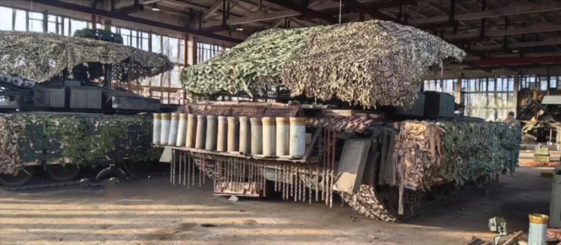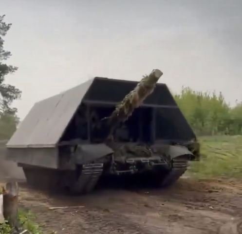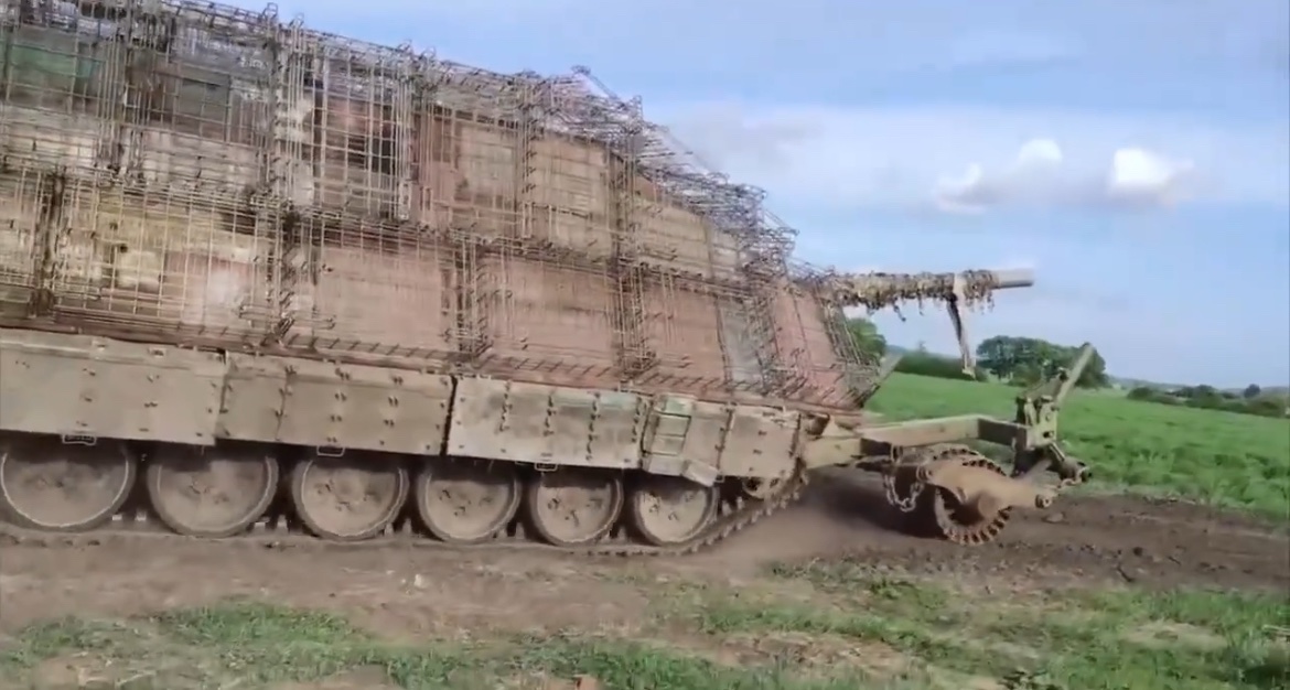 Ruský tank T-62 je osazený obřím protidronovým roštem, který pokrývá celou horní část trupu i věže, vše zakryté maskovacími sítěmi a doplněné rušičkou. Ruští tankisté (v tomto případě má jít od dílo Burjatů) se očividně snaží přežít na bojišti tváří v tvář ukrajinským dronům, které masivně ničí jakoukoli techniku nepřítele. T-62 byl sovětský hlavní bojový tank používaný v 60. a 70. letech 20. století. Do konce 70. let představoval spolu s T-54/55 základní výzbroj sovětských tankových vojsk. Vznikl modernizací konstrukce T-55 prodloužením korby a instalací kanónu U-5TS ráže 115 mm s hladkým vývrtem a stabilizací. Mezi lety 1961 a 1975 vyrobili v Uralvagonzavodu ne méně než 20 000 ks těchto tanků. Vozidlo však nepředstavovalo velký pokrok v tankové konstrukci a bylo zanedlouho nahrazeno modelem T-64 a především T-72. Zastaralé tanky T-62 ze zakonzervovaných zásob byly z důvodů enormních ztrát ruské těžké techniky nasazeny při invazi na Ukrajinu již v květnu 2022. Nejprve byly nasazovány jako statická obrana, ale s postupujícím ztrátami i v přímém nasazení s posádkami mobilizovaných branců. Podle zpráv z října 2022 ruská armáda plánuje v následujících 3 letech reaktivaci a modernizaci až 800 kusů T-62. Ruská vojska do října v bojích ztratila čtyři desítky strojů, z nichž část padla do rukou ukrajinských ozbrojených sil. Vzhledem k atypické ráži je ale jejich nasazení zde velmi sporné - patrně slouží jako "spotřební materiál" (než dojde munice) a vyprošťovací tanky a podobně.