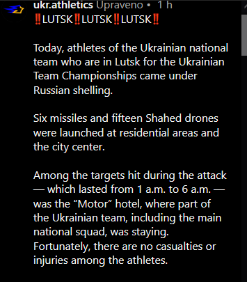 Luck, Volyňská oblast🇺🇦. Hotel Motor. To nejsou žádné vojenské jednotky nebo kasárna, to je reprezentace Ukrajiny v lehké atletice na soustředění. Obešlo se to bez obětí nebo zranění.