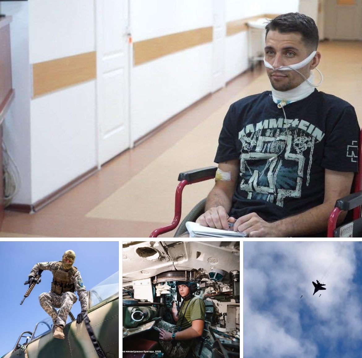 Foto: Vjačeslav po operacích. | Ukrajinský lovec dronů v malém letadle. | Mladý tankista. | Ukrajinský MiG-29 při náletu.