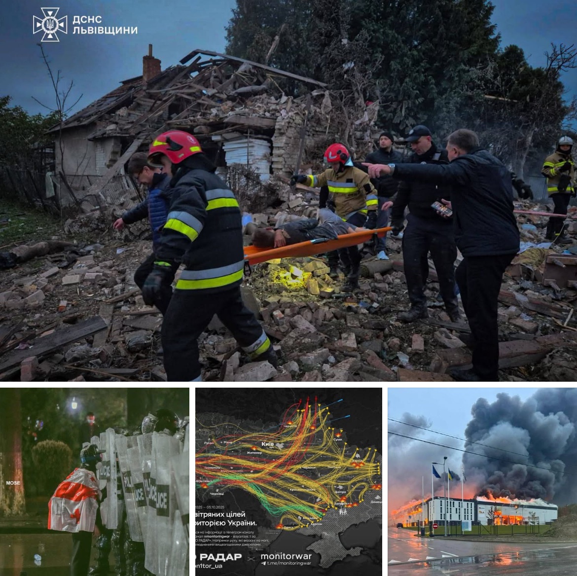 Neděle. Rusové podnikli další rozsáhlý nálet na cíle převážně na západní Ukrajině. Ve vzduchu bylo 496 dronů a 53 raket/střel, ukrajinská PVO zneškodnila 478 z nich. Zásahy hlásí Ivano-Frankivsk a Lvov. Ve Lvově byl zasažen průmyslový areál společnosti Sparrow Capital, který podle starosty neměl nic společného s armádou nebo vojenským průmyslem. V budově byly sklady polských oděvních značek Reserved, Cropp a Sinsay. Zasažena byla také energetická soustava. Tisíce lidí jsou aktuálně bez elektřiny. Celkem si nálet vyžádal nejmíň 9 obětí na životech. A také se stalo tohle: