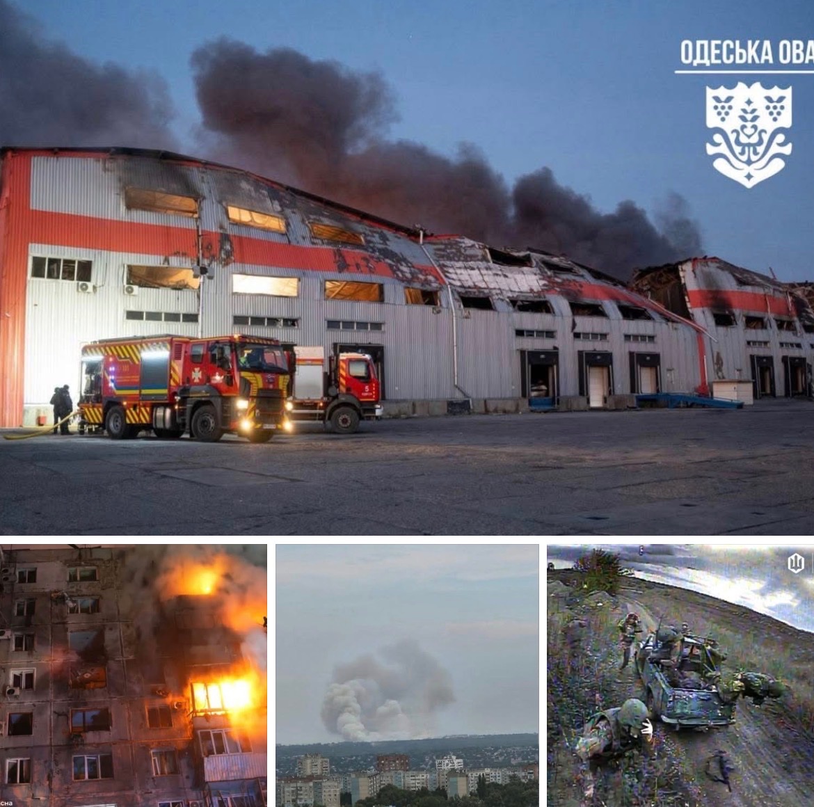 Foto: Rusové v Oděse vybombardovali areál firmy, která vyrábí bojlery, radiátory a další druhy topení. | Záporoží. | Mínus ruský muniční sklad. | Momentka z dronu.