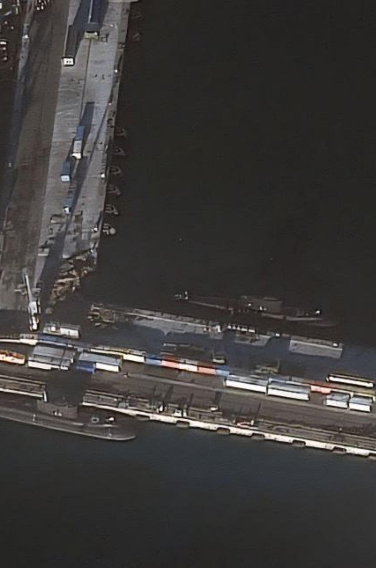 Satelitní snímek ukazuje poškozené molo několik metrů za ponorkou.