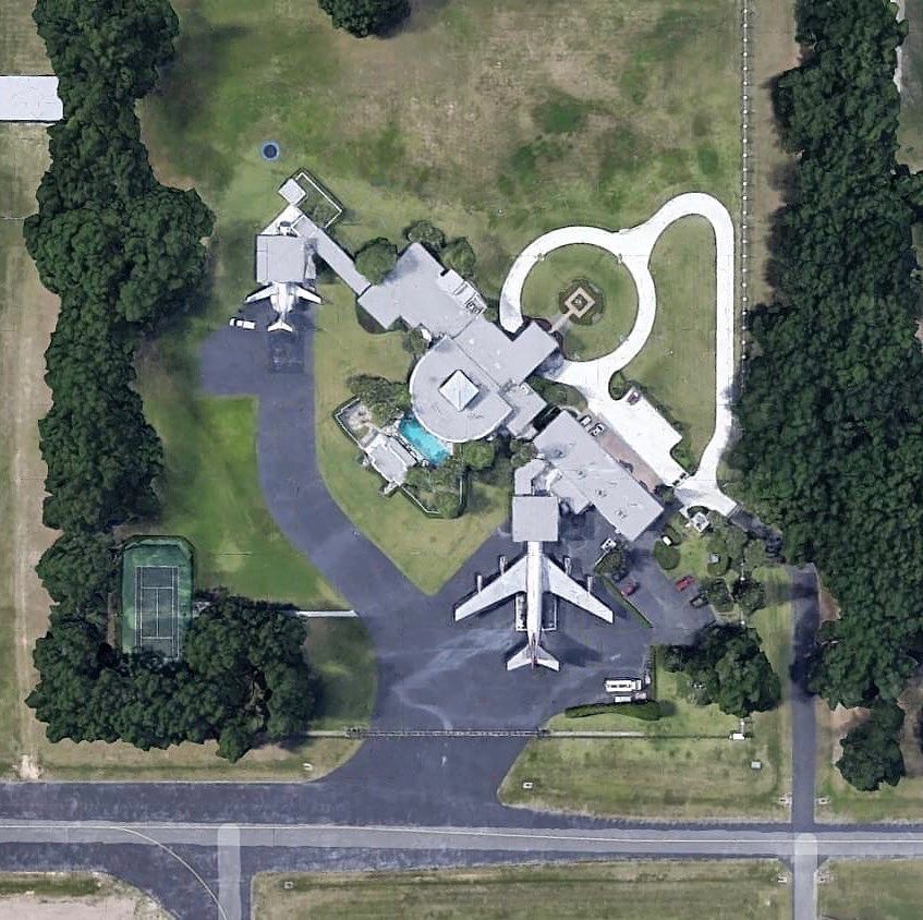 Dům herce (a pilota) Johna Travolty na Floridě. Vlevo nahoře parkuje jeho privátní Bombardier Challenger, vpravo dole Boeing 707 ex-Quantas.