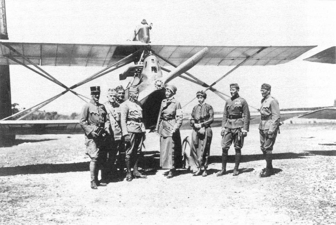 Zprava, Hptm. Brumowski, Oblt. Benno Fiala Ritter von Fernbrugg a arcivévodkyně Marie Terezie při návštěvě Flik 41/J 26. července 1917 v Sezaně. Druhá žena, zřejmě zdravotní sestra, bohužel není známa, stejně jako nejsou známy identifikace čtyř mužů vlevo.