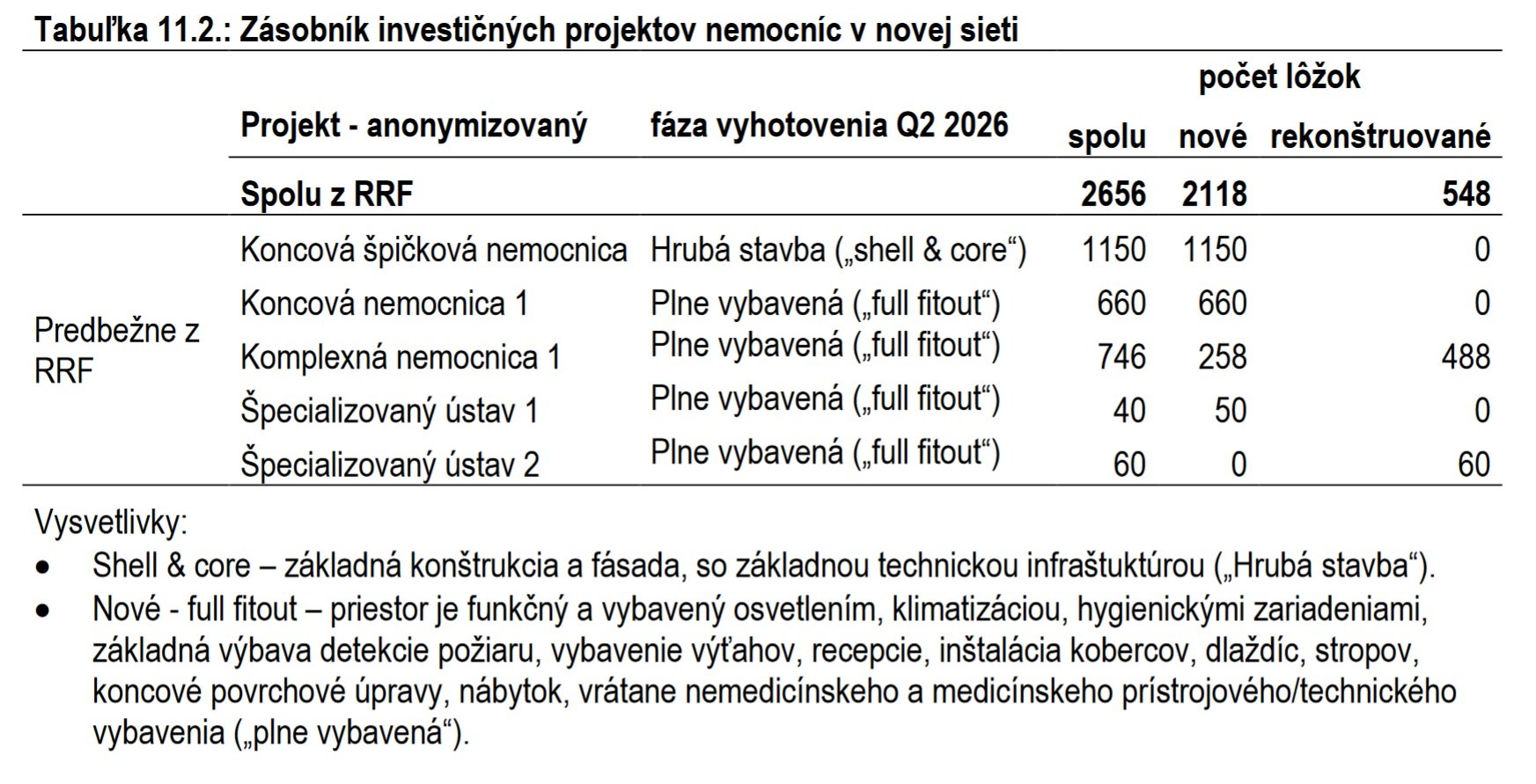 Slovenský Plán obnovy a odolnosti (POO) schválený Európskou Komisiou (EK) obsahuje KOMPONENT 11: Moderná a dostupná zdravotná starostlivosť. Vrámci komponentu nás zaujíma "Investícia 2: Nová sieť nemocníc – výstavba, rekonštrukcie a vybavenie". Investícia obsahuje (EK preplatí) tieto investičné projekty (ak sa stihnú realizovať v termíne):
