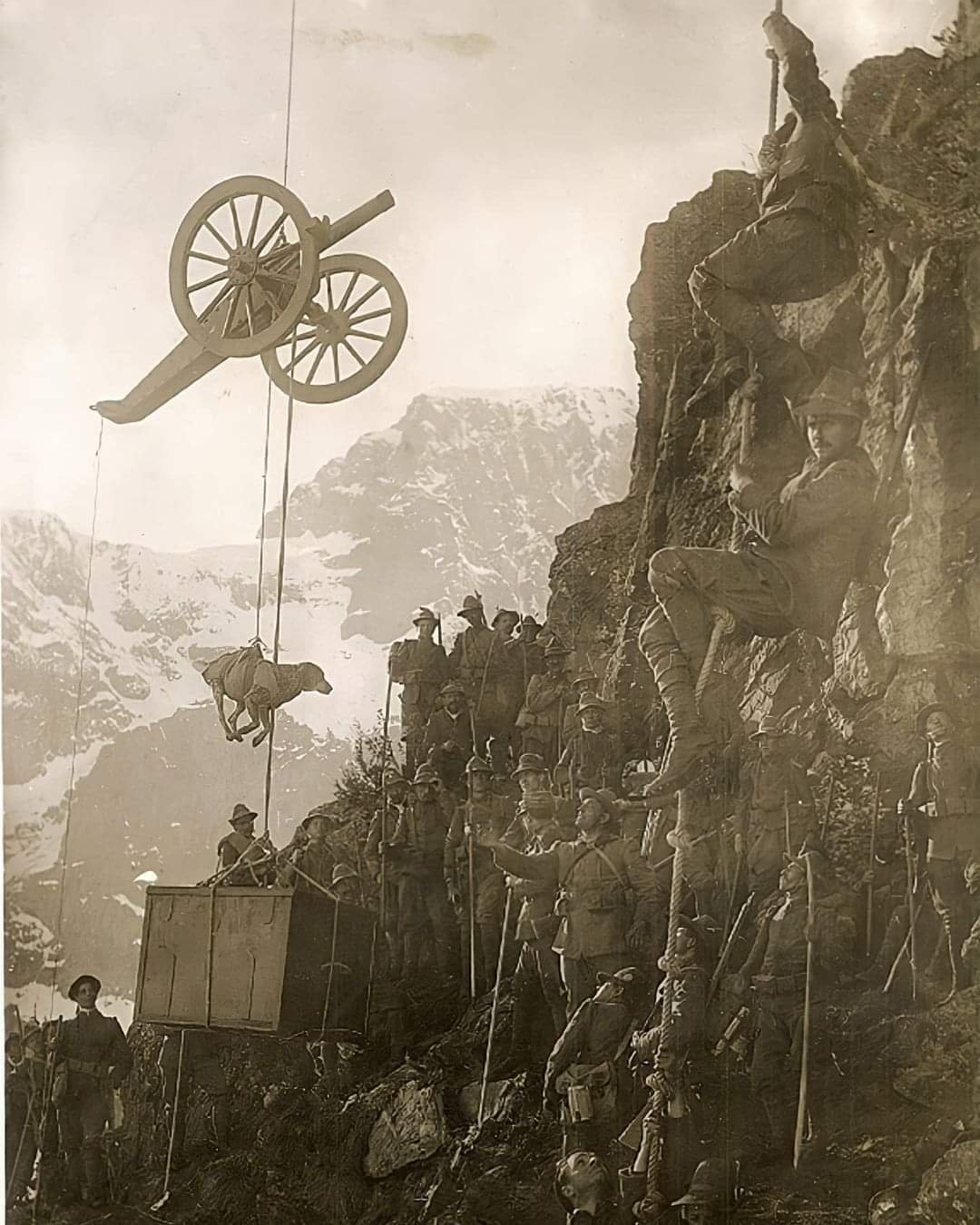 Italští Alpini v neschůdném terénu horského masívu Dolomit, (1915).