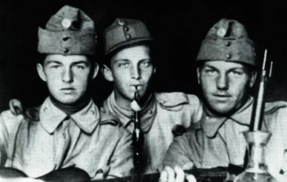 Mladičký Konrad Henlein (uprostřed) jako vojín v důstojnické škole (1916)