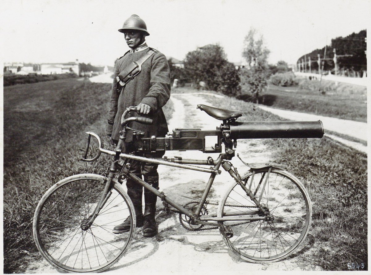Italský voják předvádí kolo, vyzbrojené kulometem Fiat Revelli model 1914. Zajímavé je, že nejde pouze o transportní prostředek, ale palbu bylo možno vést přímo. Jen bylo nutno opřít kolo o jakýsi stojan a nasadit nábojový rámeček. Patrně zůstalo pouze u prototypu a kolo nebylo zavedeno do služby. Přeci jen při transportu bylo nutno vypustit vodu z chladiče hlavně.