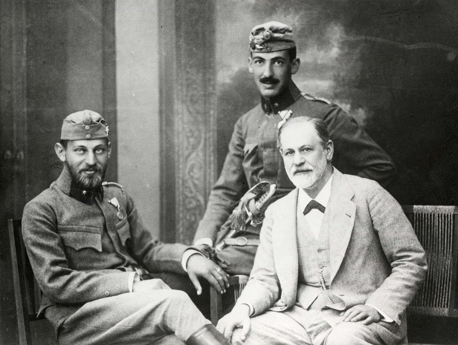 Sigmund Freud se svými syny Ernstem a Martinem ve vojenských uniformách rakousko-uherské armády, kolem roku 1916. Svého otce navštívili před odjezdem na frontu.