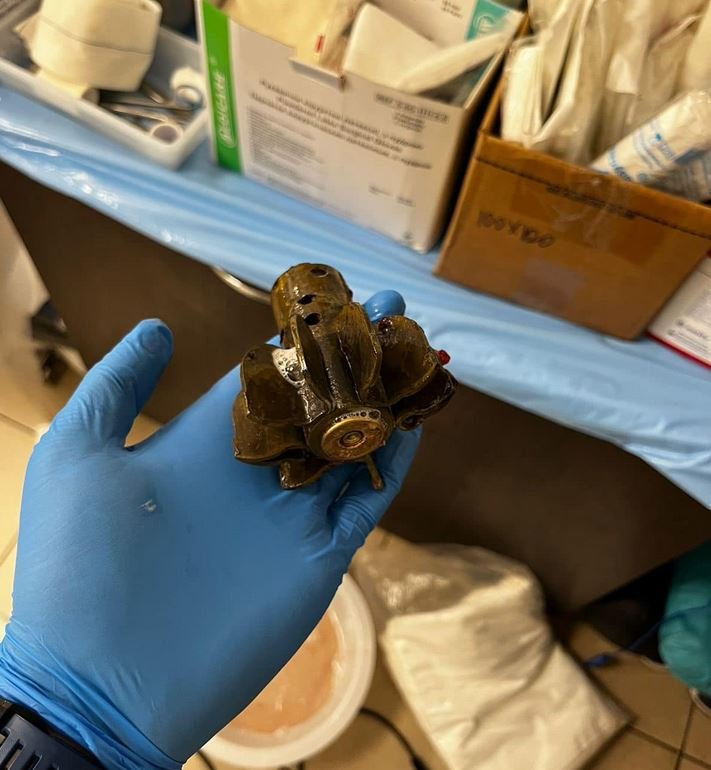 Ukrajinští vojenští lékaři odstranili stopku miny z těla vojáka! Při dodatečném vyšetření lékařů jedné z frontových nemocnic byl v těle zraněného vojáka nalezen cizí předmět, jehož obrysy připomínaly zadní část minometného granátu. Na místo byl povolán tým sapérů, kteří po prošetření potvrdili, že cizí předmět lze bezpečně odstranit. Lékaři se rozhodli operovat a odstranit dřík, který nyní vidíte na fotografii. Stav pacienta je nyní stabilizovaný. Voják je připravován na další převoz a následnou rehabilitaci.