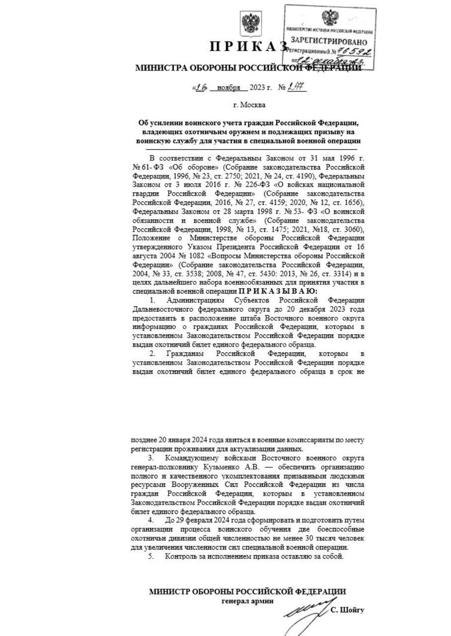 Ministr obrany Sergej Šojgu nařizuje v Dálněvýchodním federálním okruhu naverbovat 30 000 mužů. Přednostně z obyvatel kteří vlastní lovecké zbraně a mají zakoupené lovecké lístky. Budou z nich do 29. února 2024 zformovány dvě divize...