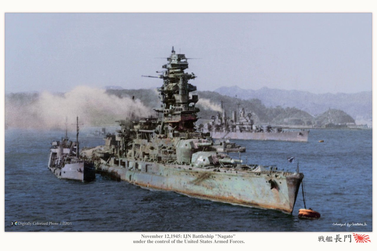 Japonská bitevní loď Nagato (jediná válku přeživší japonská bitevní loď) ve stavu po kapitulaci Japonska. V pozadí je vidět americký křižník třídy Cleveland.