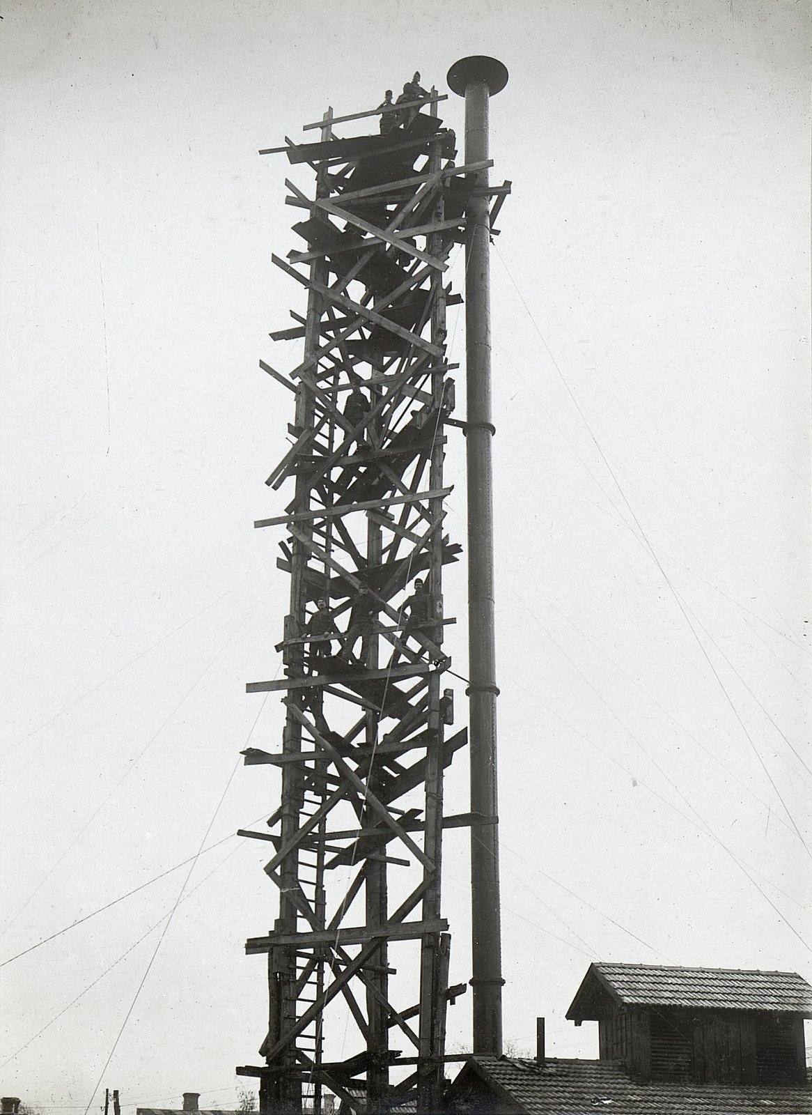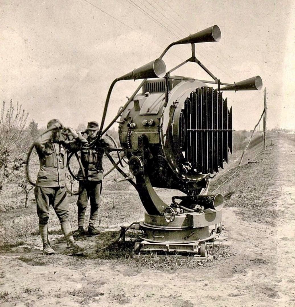 Rakousko-uherská posádka protiletadlového světlometu s integrovaným akustickým zaměřovacím zařízením někde na italské frontě roku 1918.