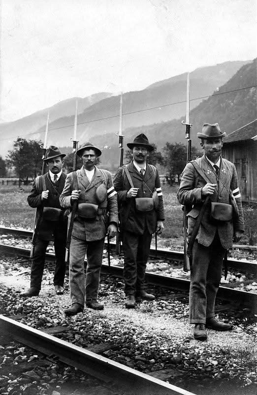 Landšturmáci v civilním oblečení s páskami a distinkcemi na klopě saka.